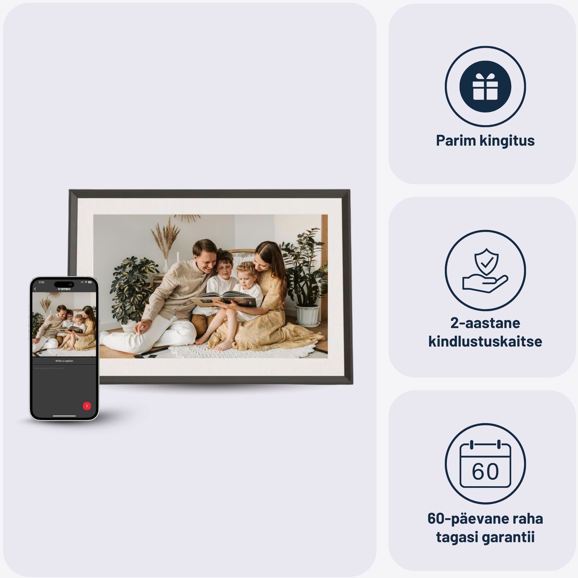 Kõik raamid on 2-aastase kindlustusega, mis katab tehasevead ja tavakasutuse rikked.